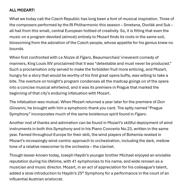 That same sense of urgency is reflected in the overture’s opening notes. Frenetic (and famously difficult) melodic figures seem to scurry this way and that in the strings and bassoons until, somehow, they come together to create a playful and boisterous theme which romps happily throughout the overture. The original title to Beaumarchais’ play, “La Folle Journée” (“the crazy day”), is a perfect description of the music here. Moods shift like quicksilver, a comedic helter-skelter atmosphere prevails, and there is no rest. At one point, Mozart had considered adding a contrasting slow tune for oboe but deleted the idea, preferring instead a seemingly unstructured outpouring of nervous energy. Listen for the prominence and independence of the winds, a particularly unusual compositional choice for the late