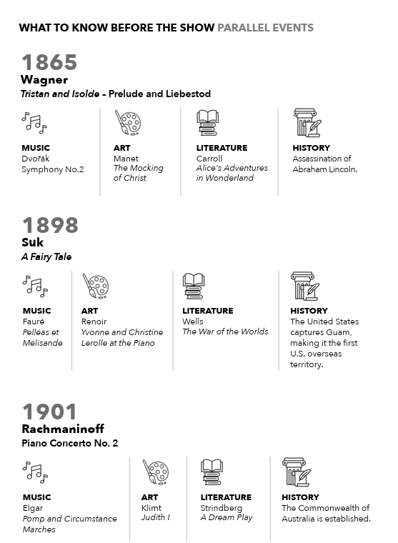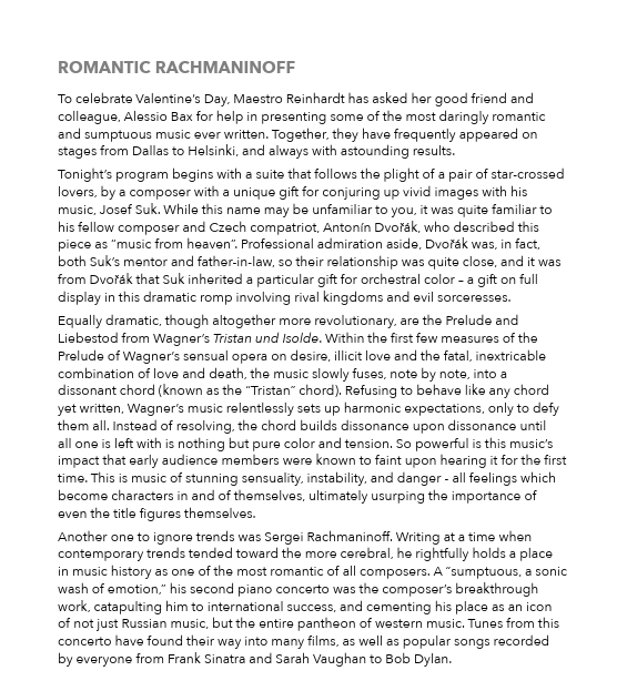 At its essence, one might say the work begins with love, moves to play, then to death, and finally back to the healing power of love. Its original source material is incidental music Suk had composed for a play that weaves classic fairy-tale motifs with mythology in a distinctly Bohemian way. He was so taken with what he wrote for the play that he immediately set out to distill the best of what he had written into an orchestral suite. For better or for worse the original play never gained more than local fame, but the suite continues to capture the hearts of audiences throughout the world. It is that suite that we hear tonight.